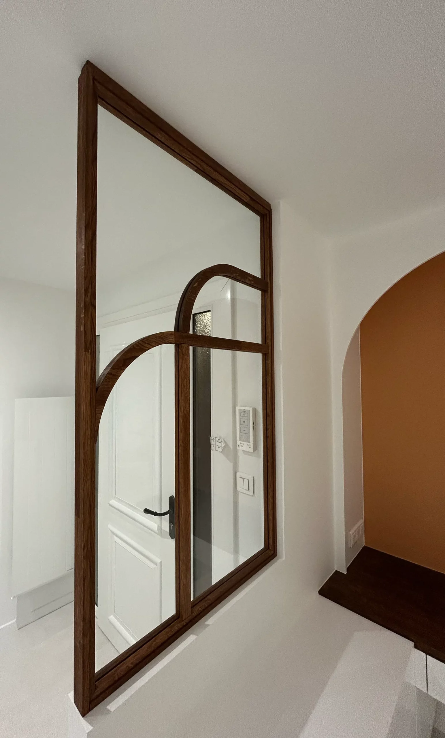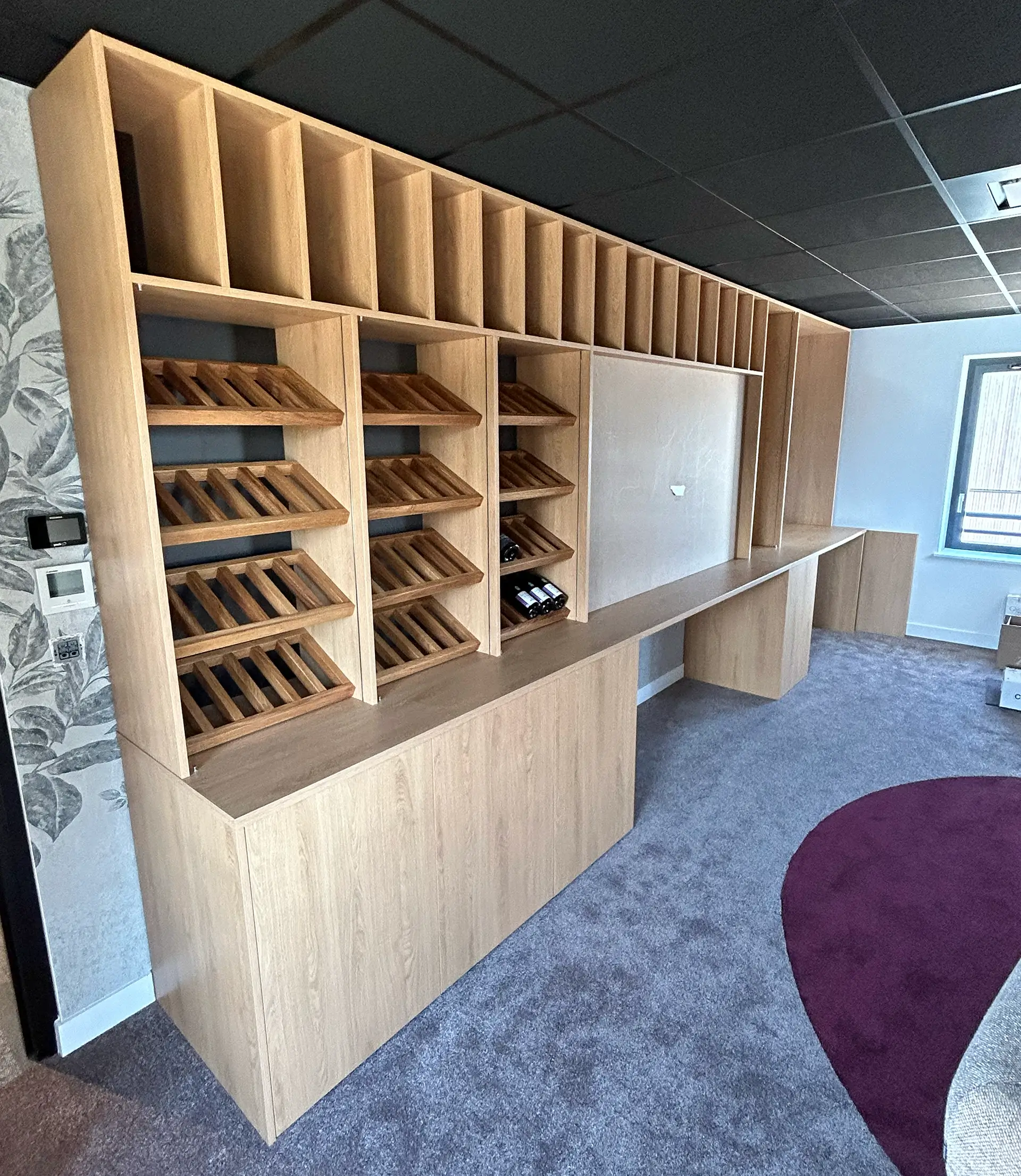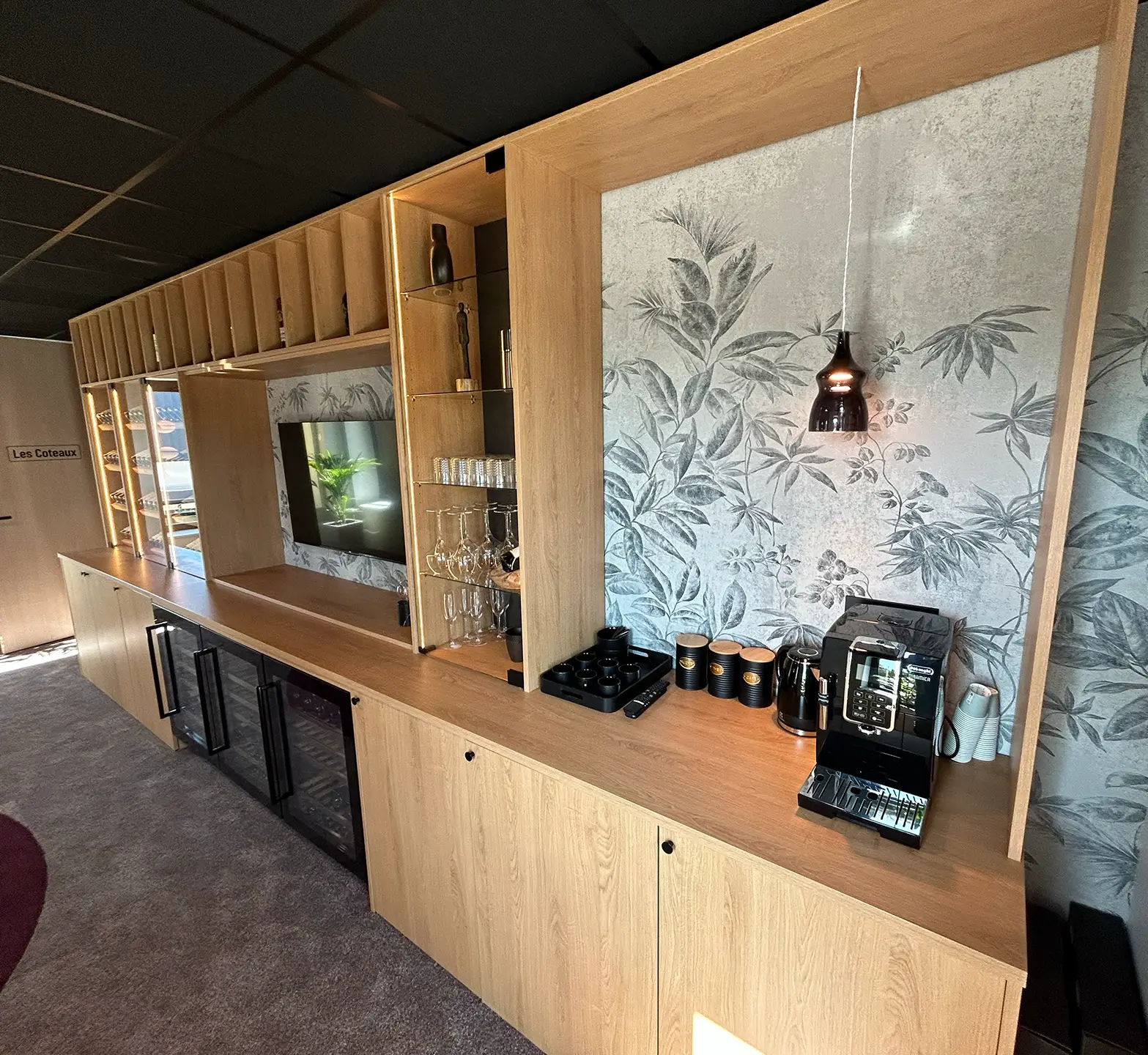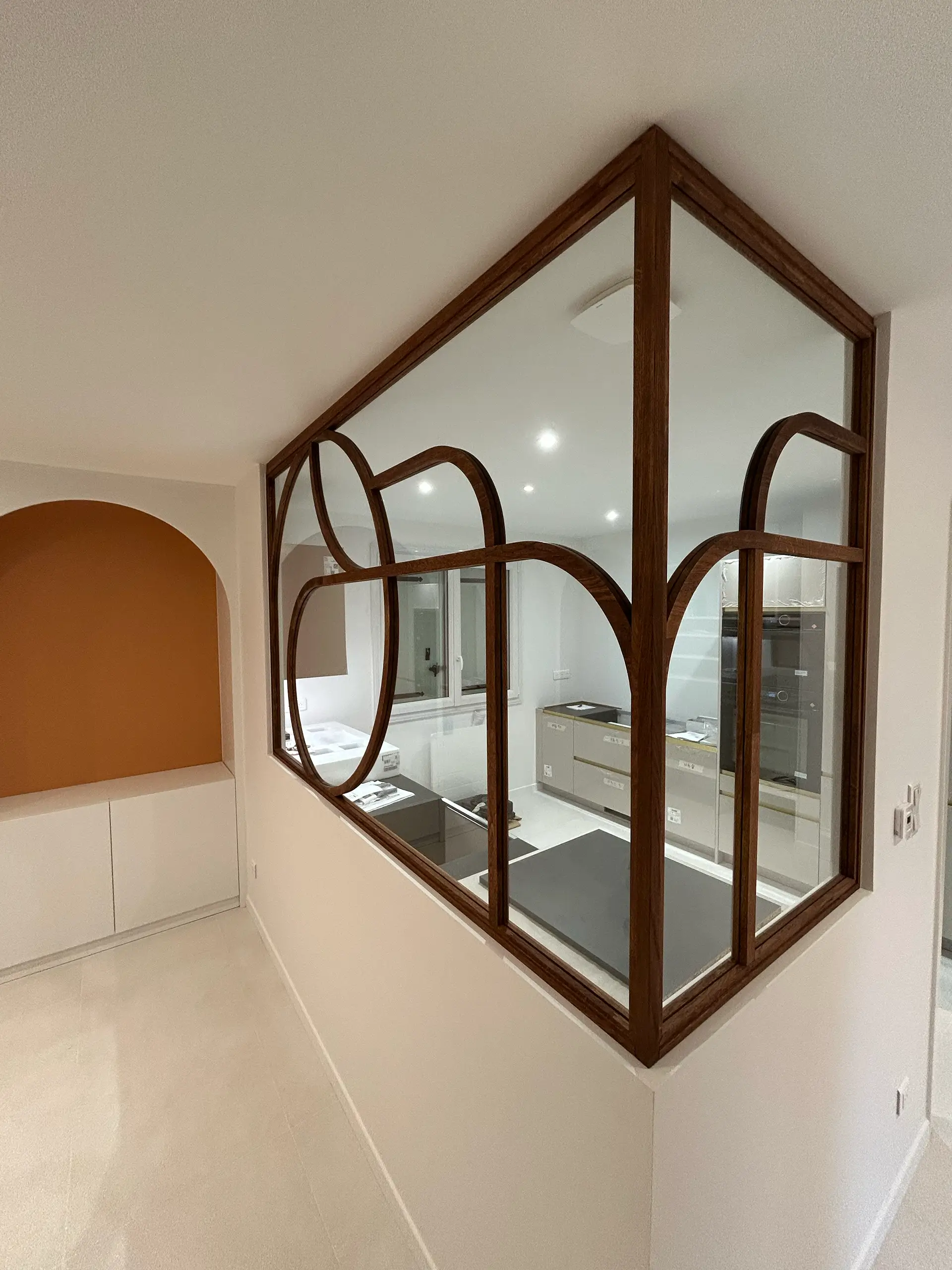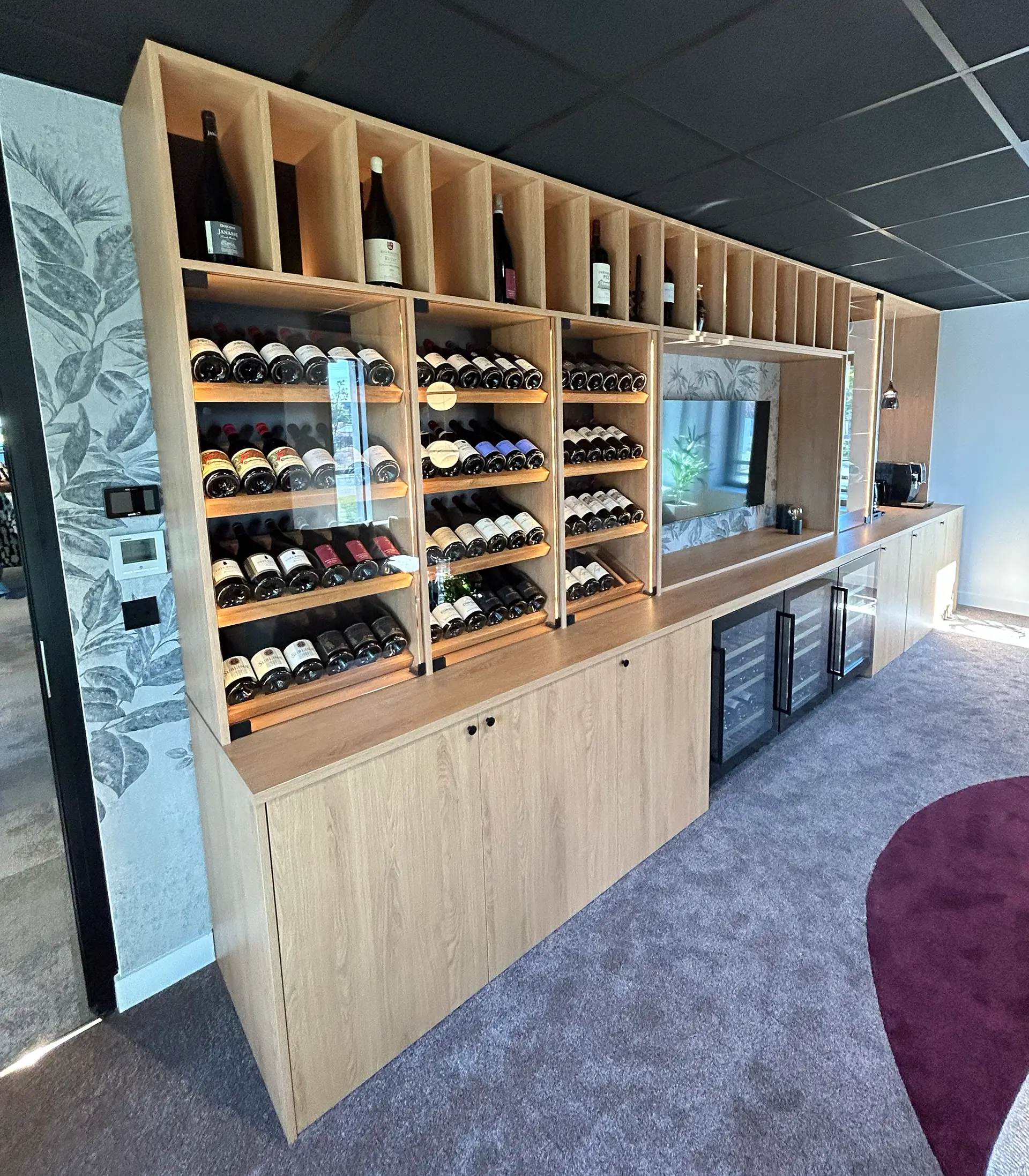 Les lignes courbes viennent adoucir les volumes et guider le regard, tandis que le sur-mesure permet d’exploiter chaque recoin avec justesse. Rien n’est plaqué : chaque meuble trouve sa place, répond à un usage précis et participe à l’équilibre global du lieu.