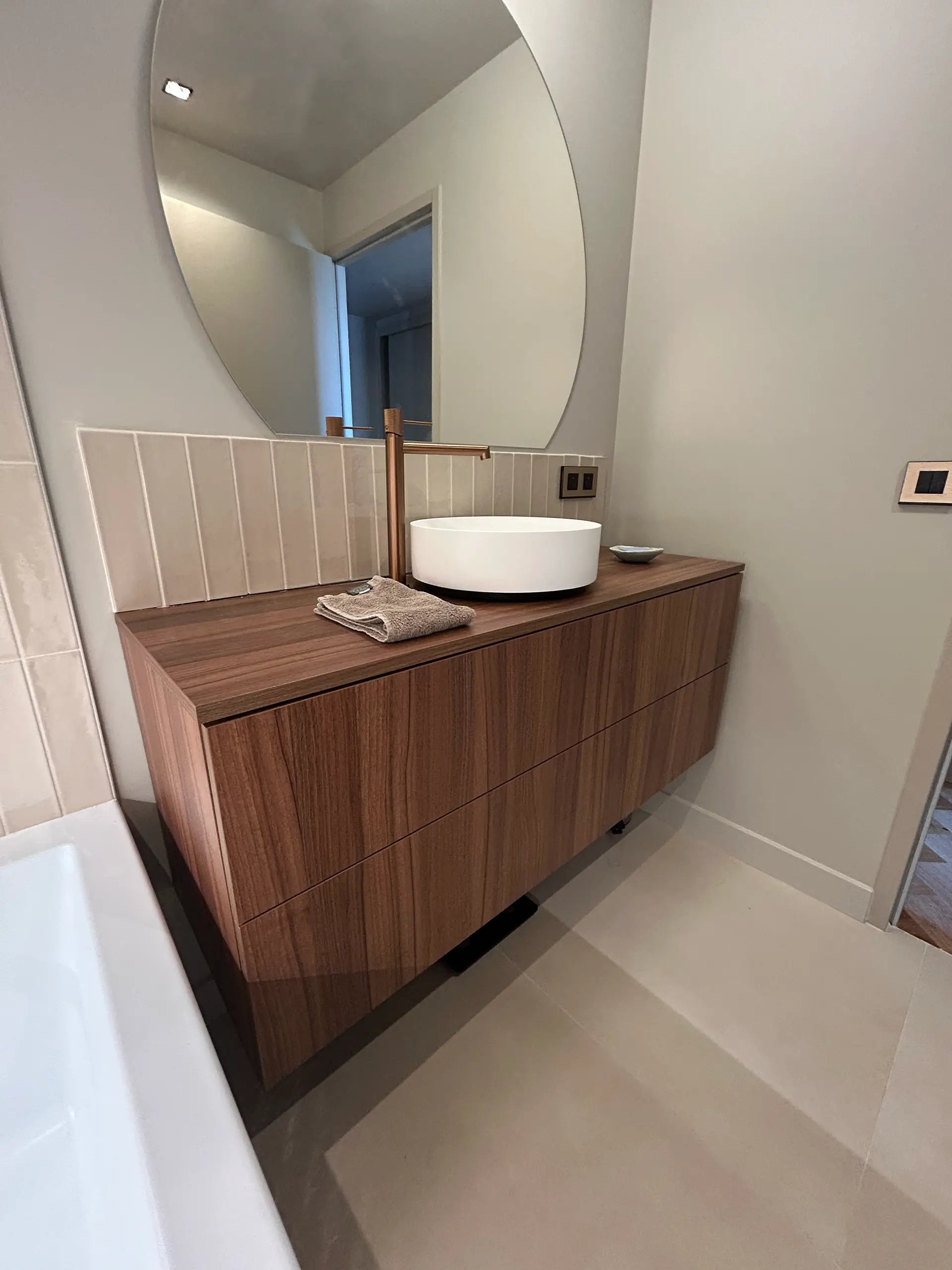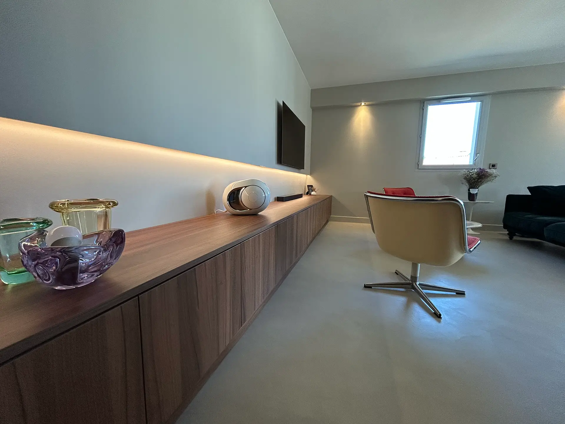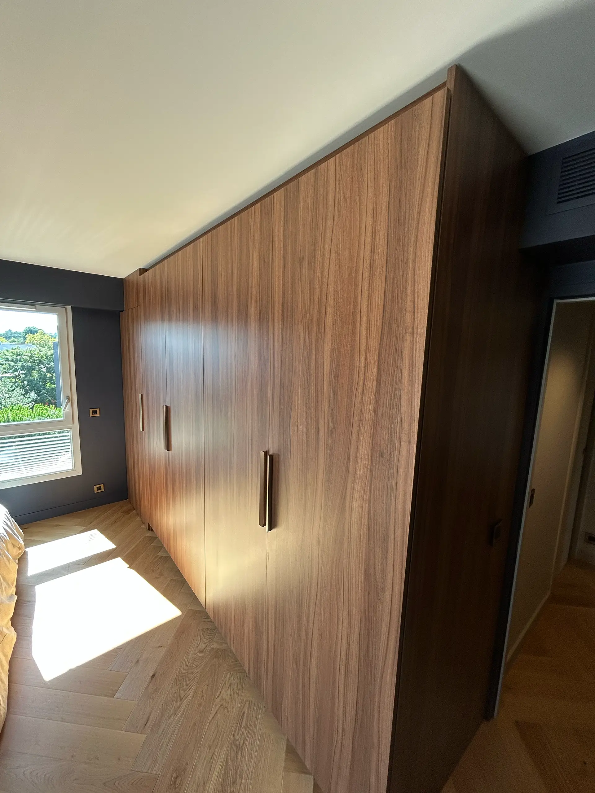 Cuisine, rangements, dressing, meuble de salon et salle de bain partagent la même essence foncée, travaillée avec finesse pour instaurer une atmosphère chaleureuse et cohérente.