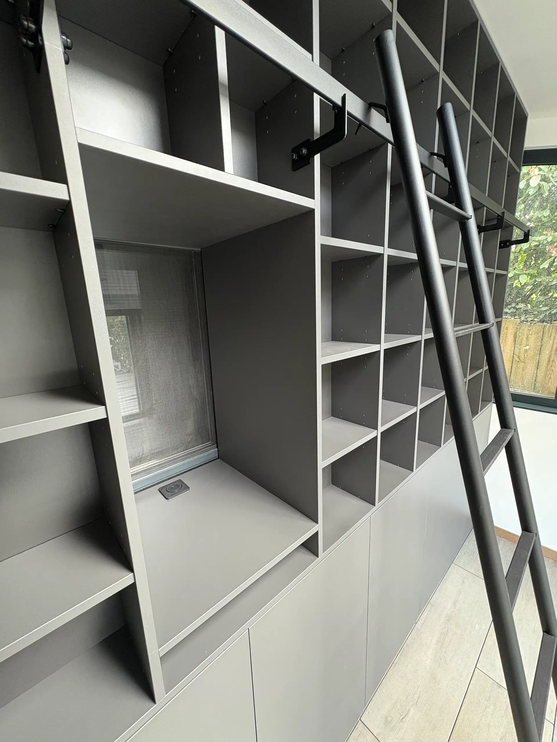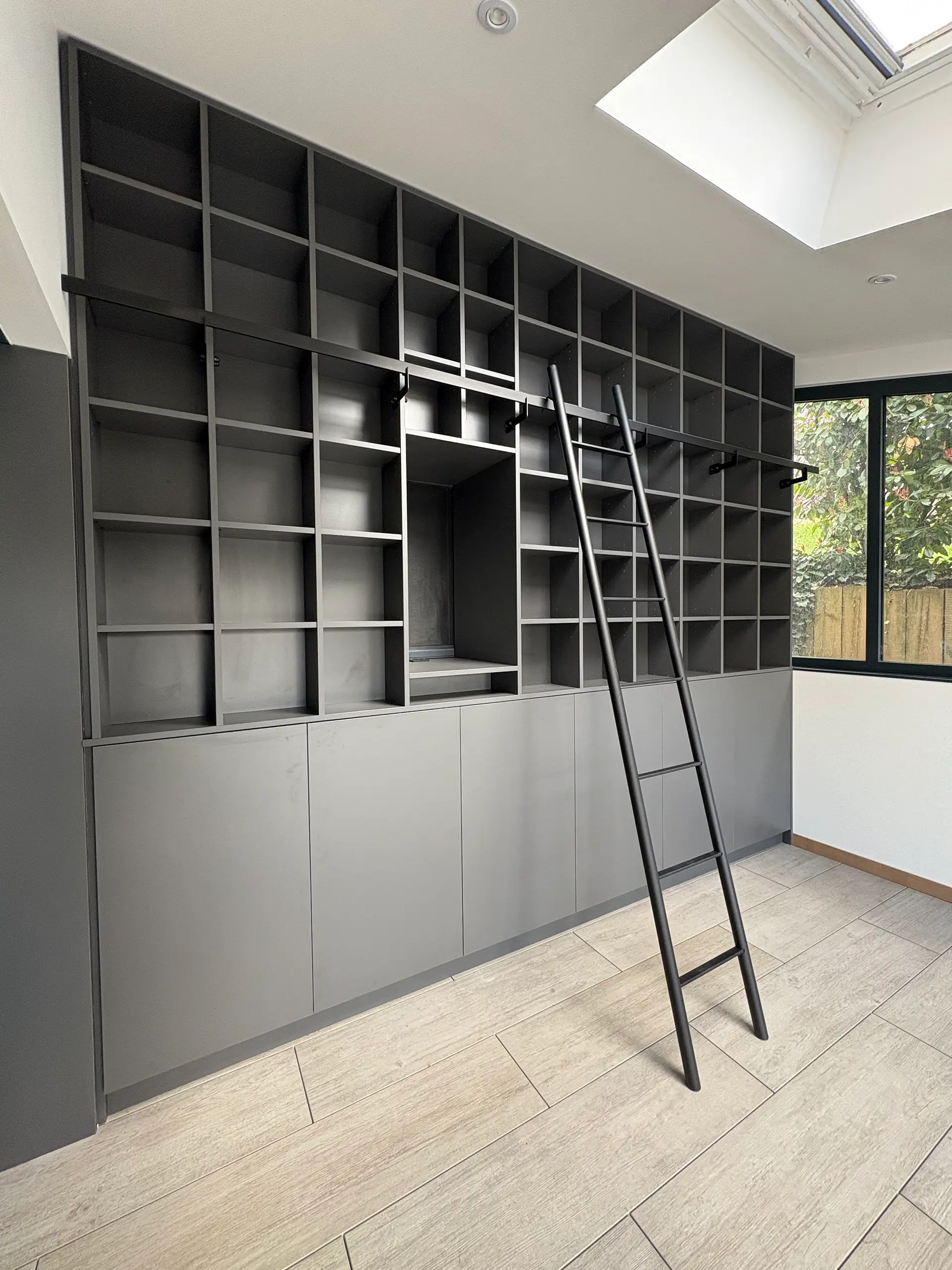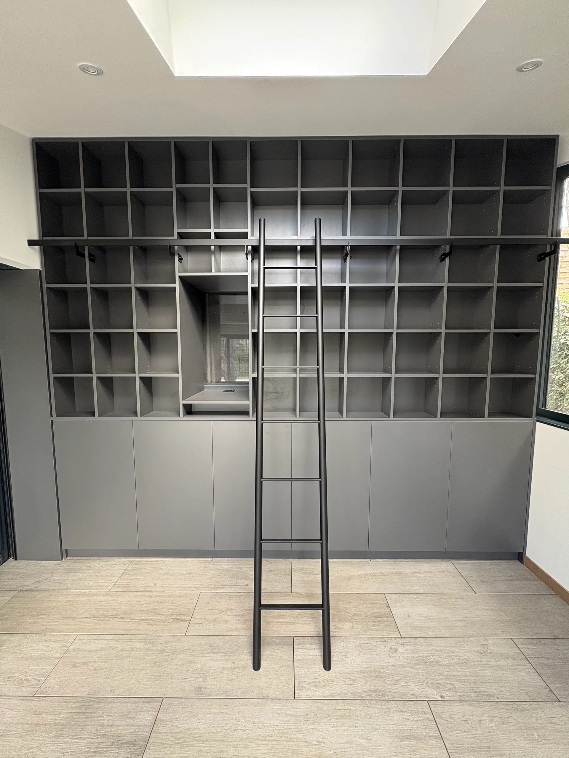 Une échelle intégrée permet un accès fluide aux volumes hauts tout en renforçant le caractère architectural de l’ensemble.